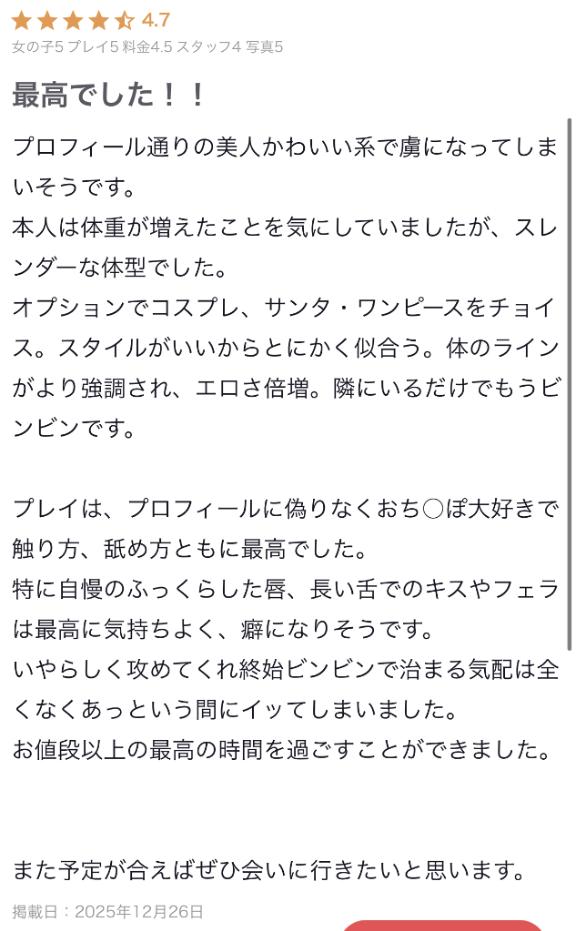 コスプレも選んでくれてありがとう♡サンタのワンピース、楽しんでもらえてたなら安心だし、雰囲気ごと味わってもらえたなら何より☺️一緒に過ごした時間が「お値段以上」って思ってもらえたこと、本当に嬉しい♡
