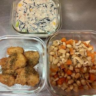 タラのタレカツ、五目煮豆、ひじきの白和え