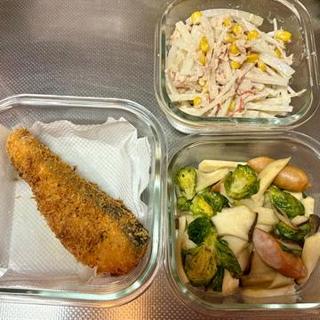 鮭のフライ、芽キャベツとエリンギのコンソメ炒め、大根サラダ