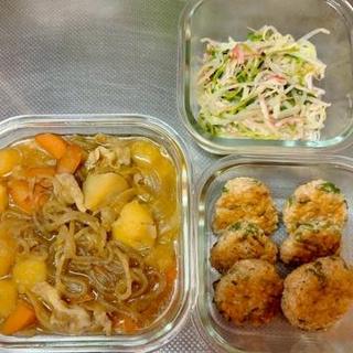 肉じゃが、明太つくね、もやしと豆苗のマヨ和え