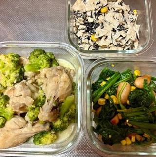 手羽元とブロッコリーのクリーム煮、ほうれん草のソテー、レンコンとひじきのツナマヨサラダ